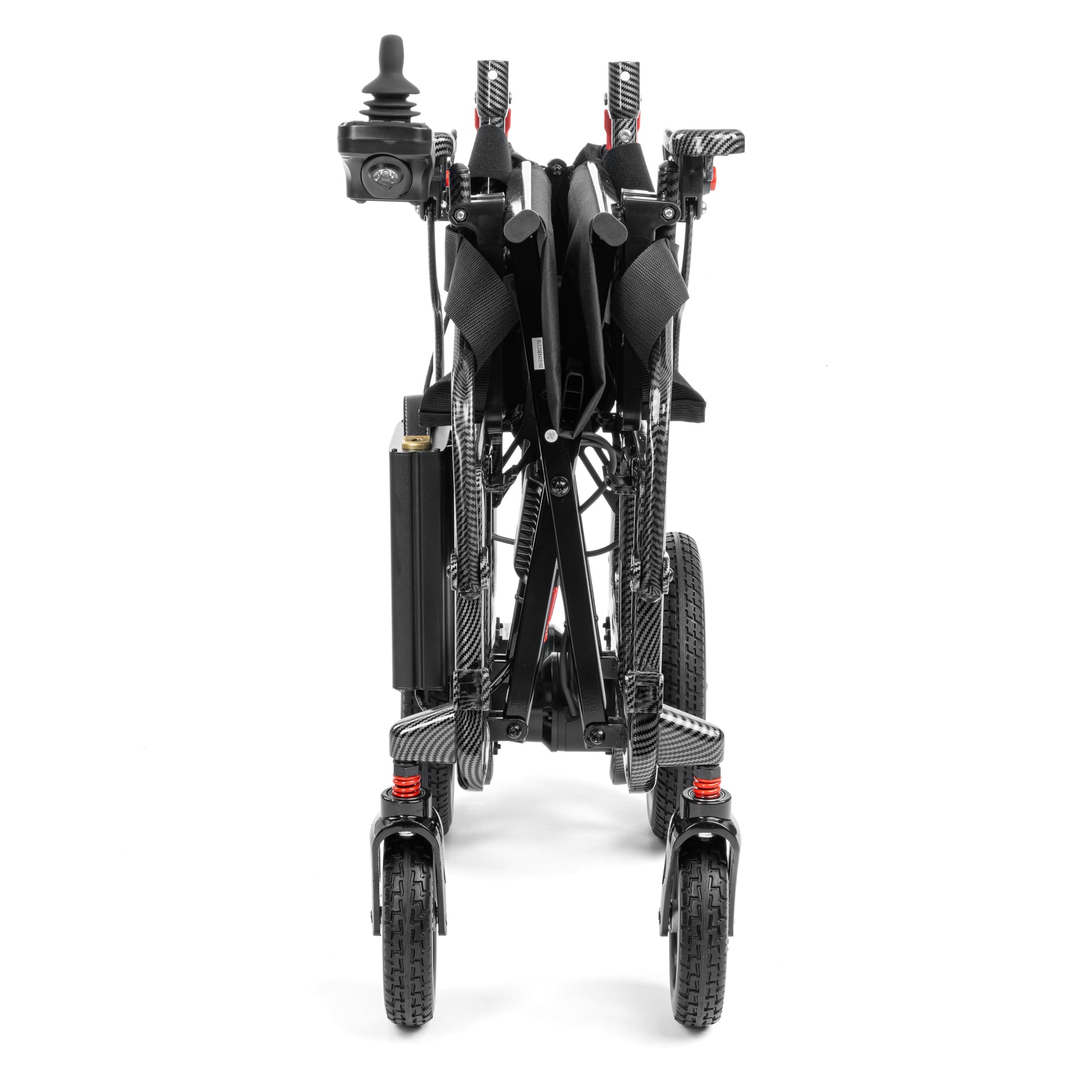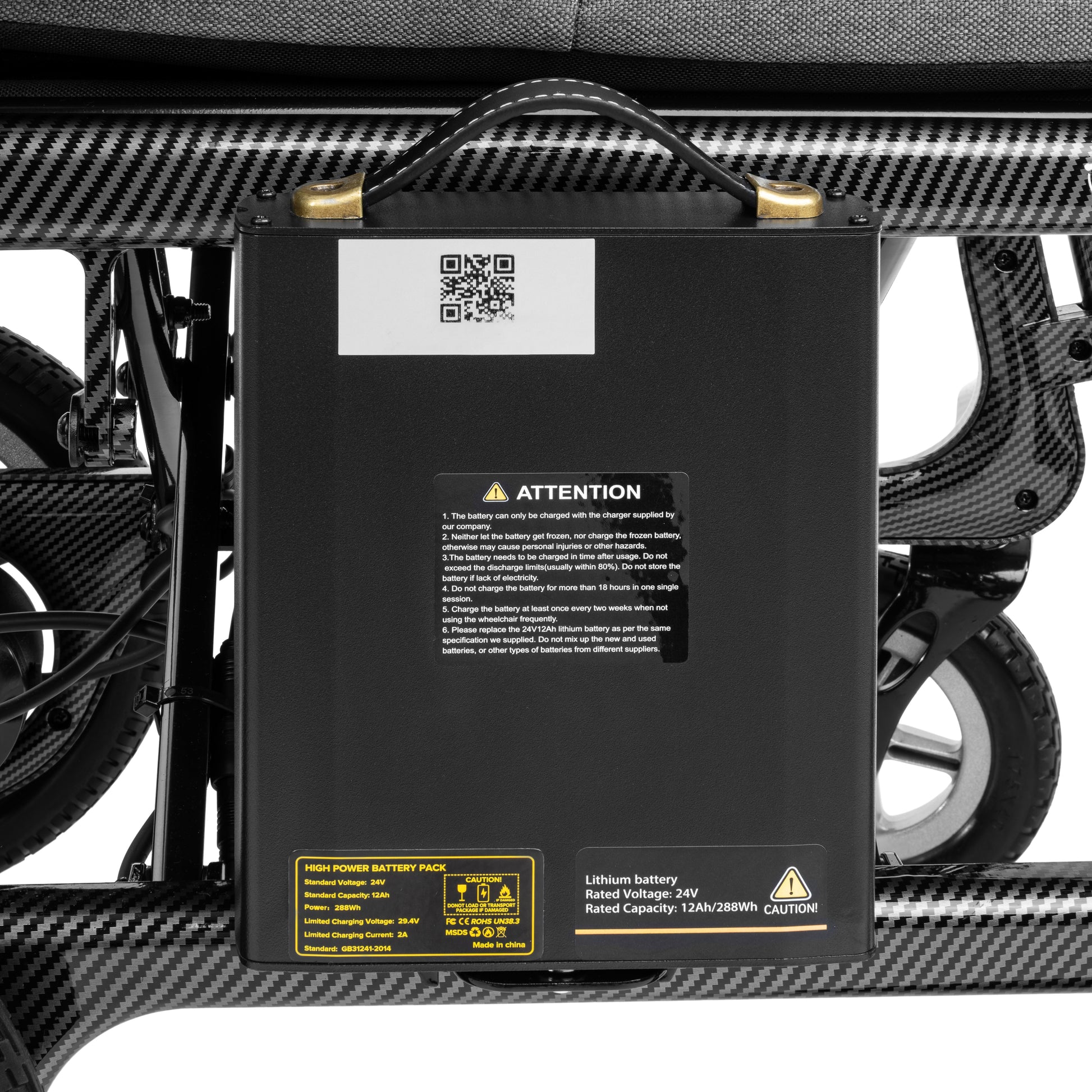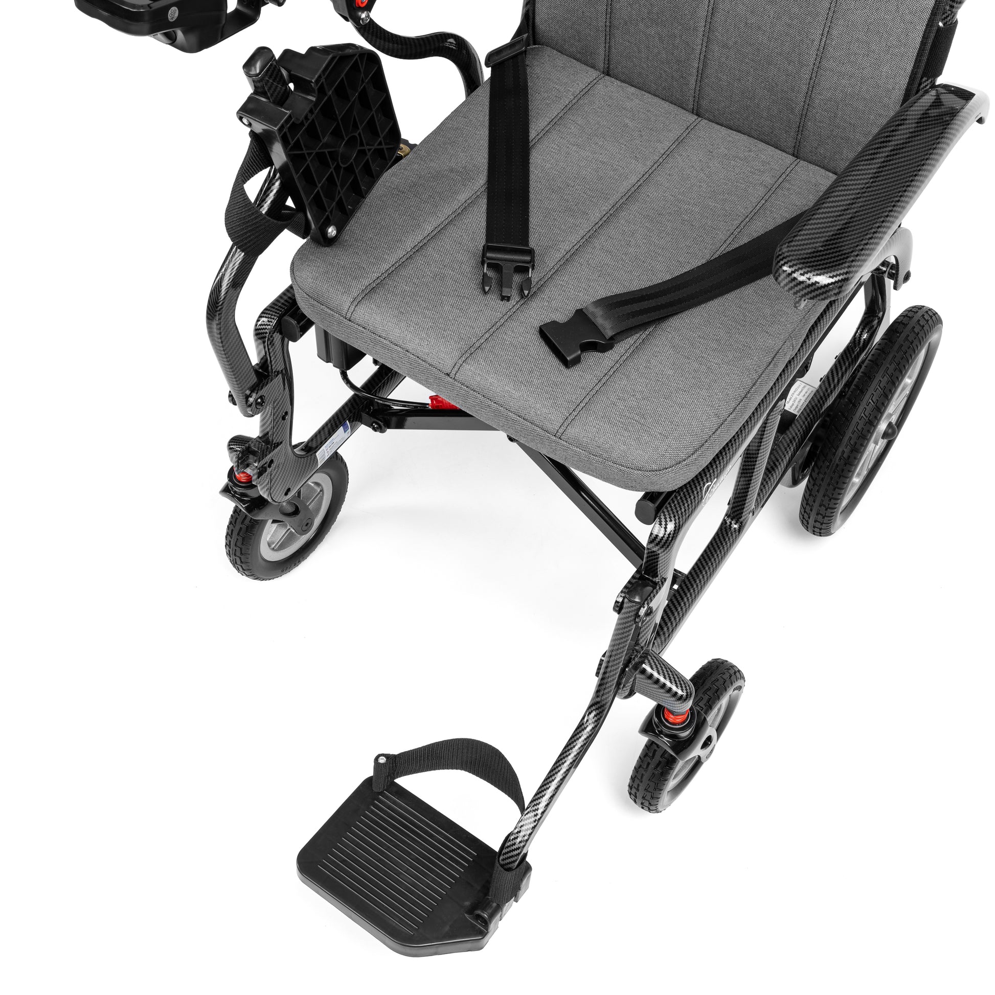 Opklapbare armsteunen en voetsteun maken het in- en uitstappen eenvoudig. Een handige achterzak biedt ruimte voor je persoonlijke spullen. De batterij is eenvoudig te verwijderen en kan zowel op als buiten de rolstoel worden opgeladen.