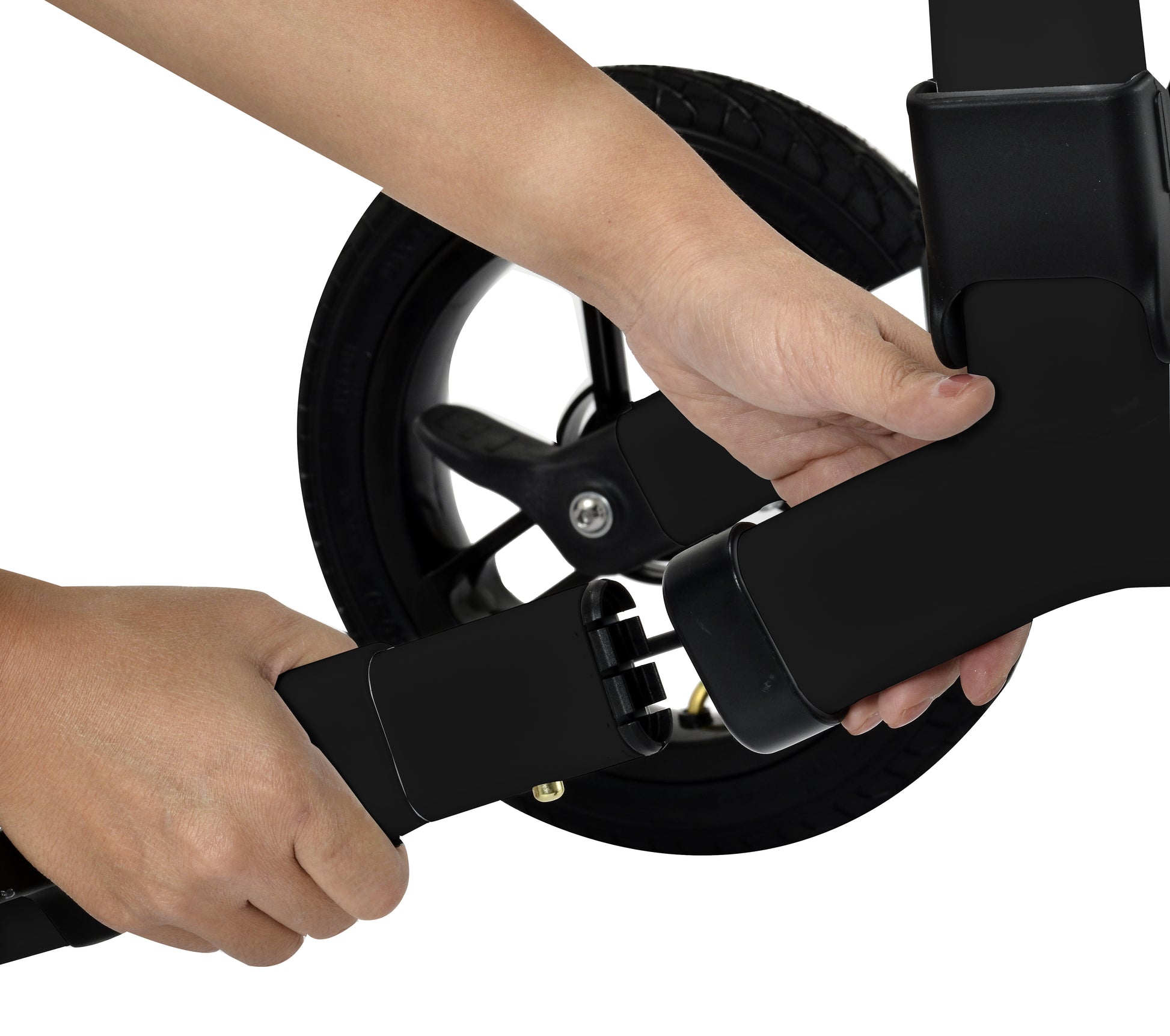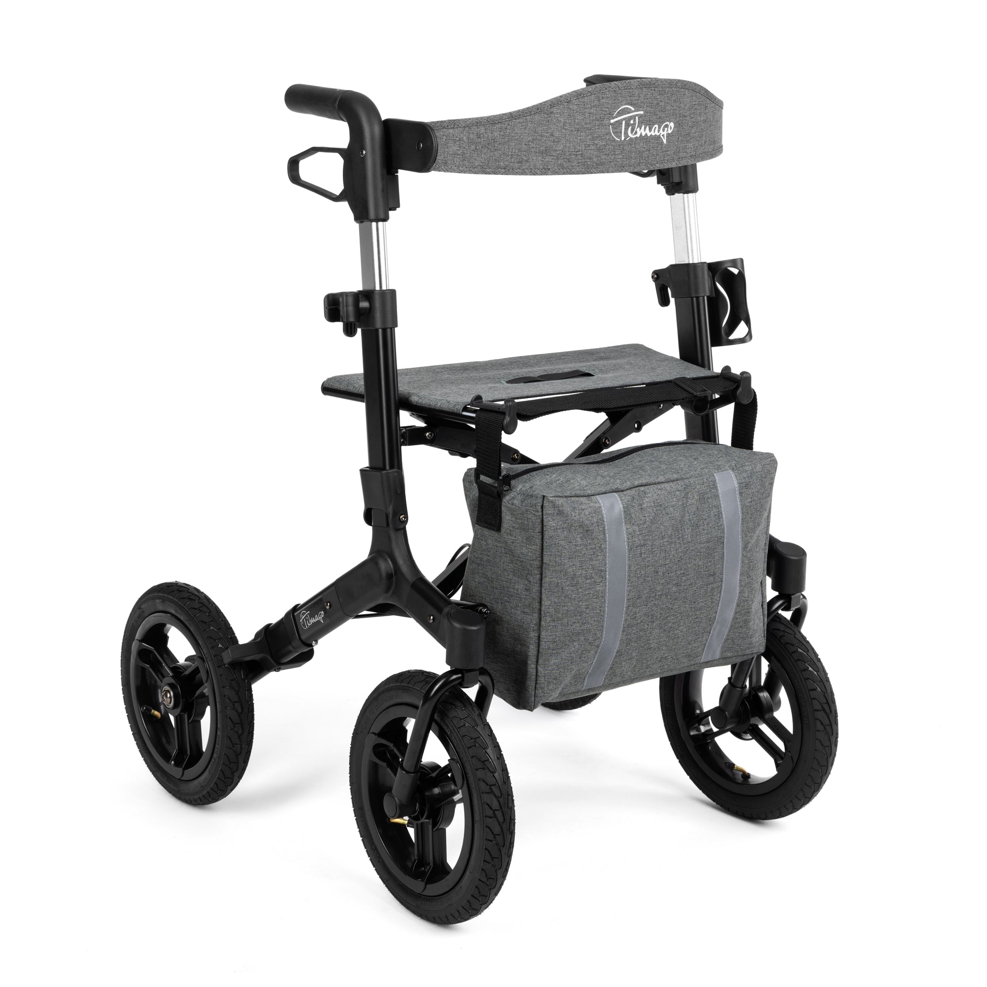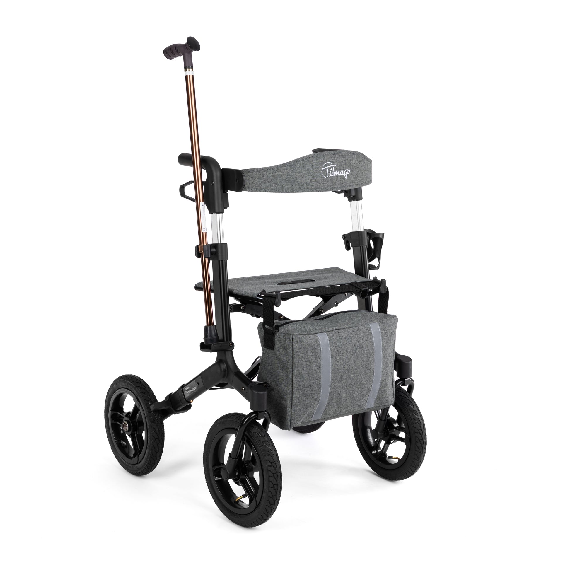 Inbegrepen set: frame met zitting, voorwielen, poten met achterwielen, rugleuning, boodschappentas, pomp, bekerhouder en stok-/krukhouder.