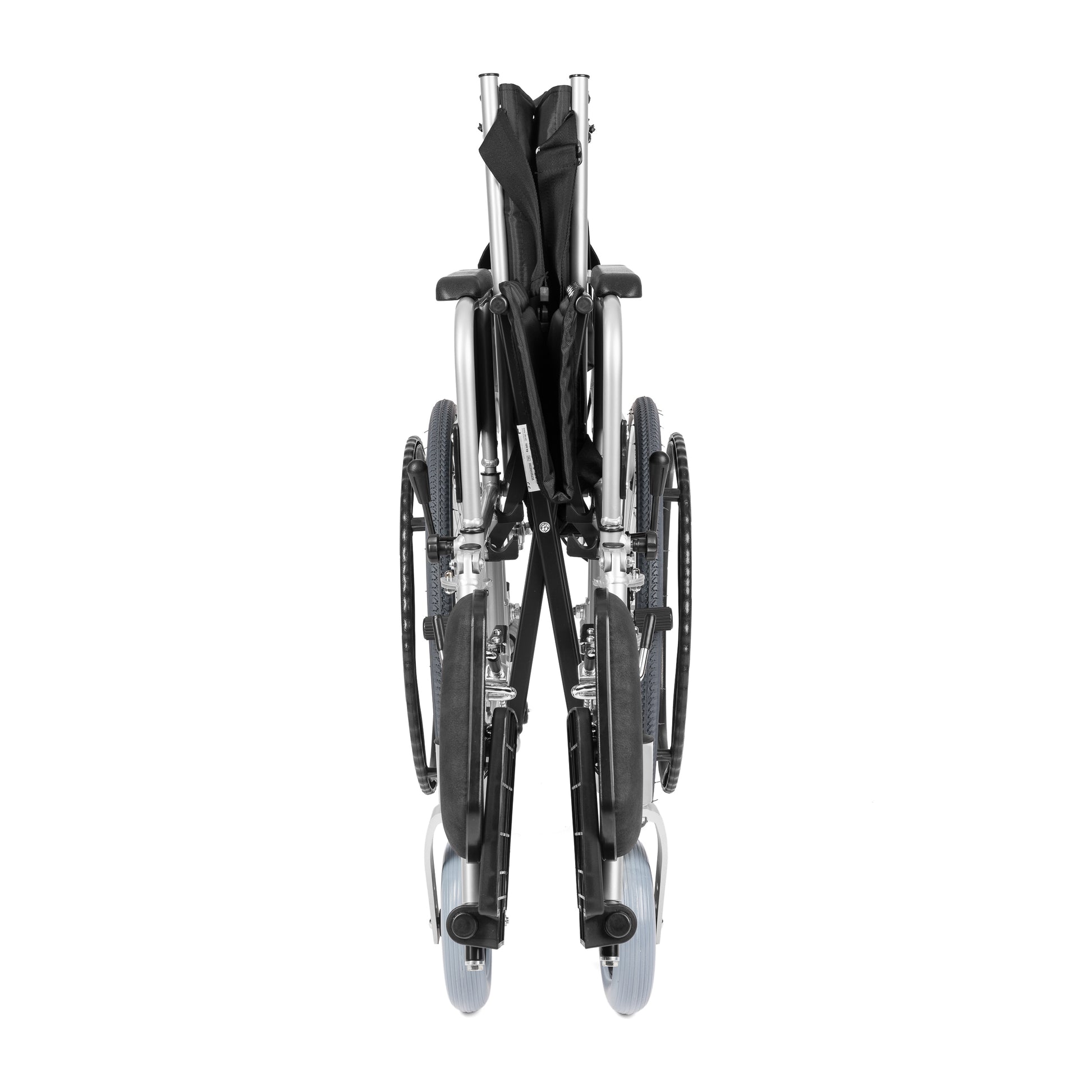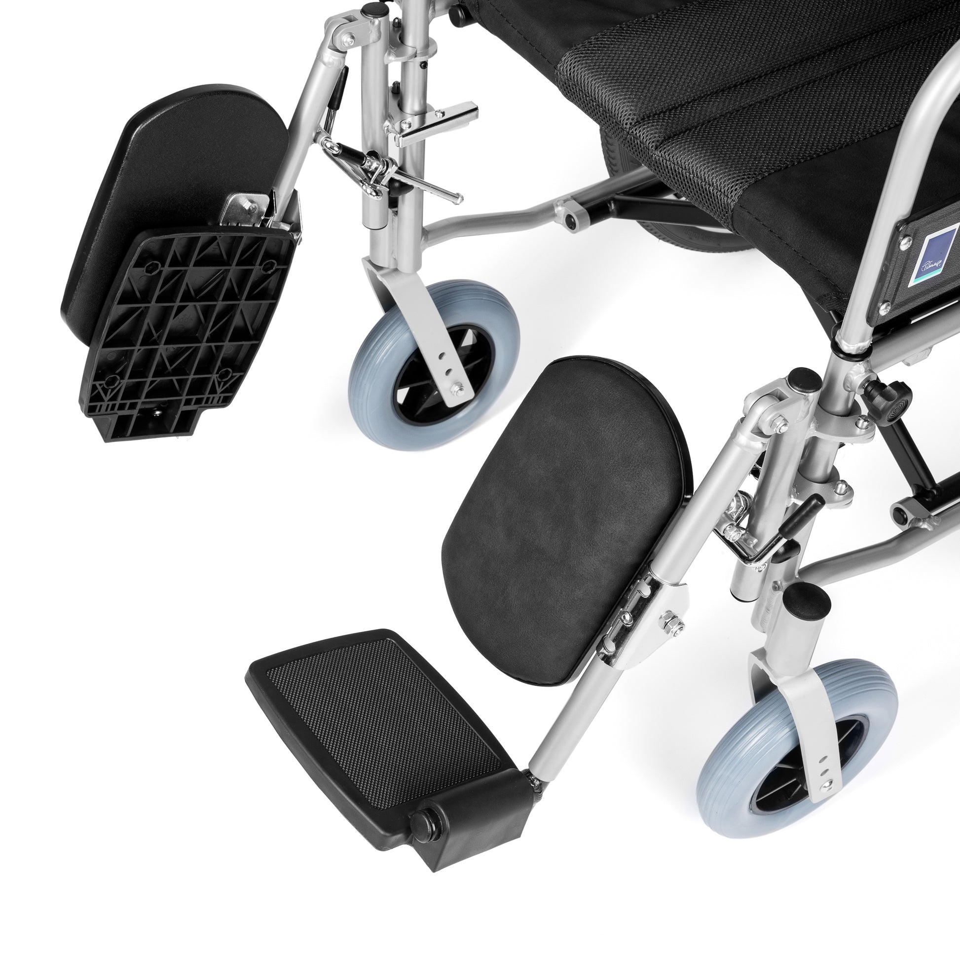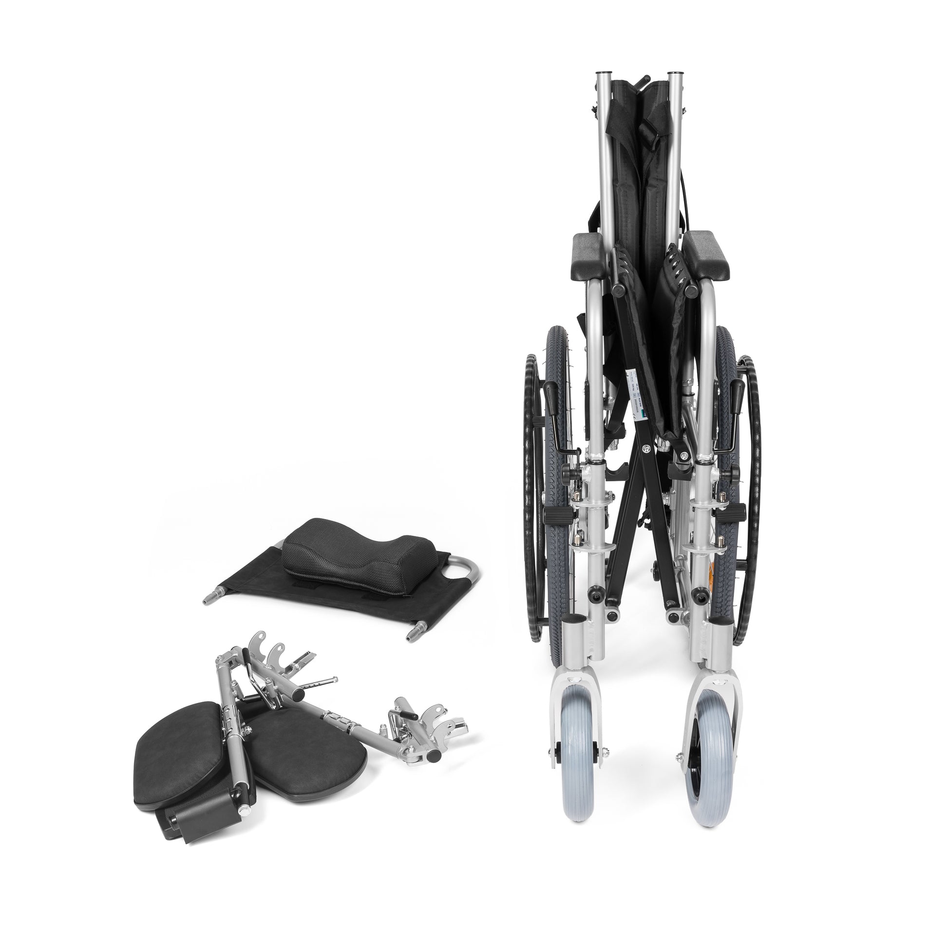Maximale veiligheid: Uw veiligheid staat voorop. De rolstoel is standaard uitgerust met anti-kiepwielen, stabilisatiegordels en een comfortabele hoofdsteun met klittenbandbevestiging. Zo kunt u met een gerust hart op pad