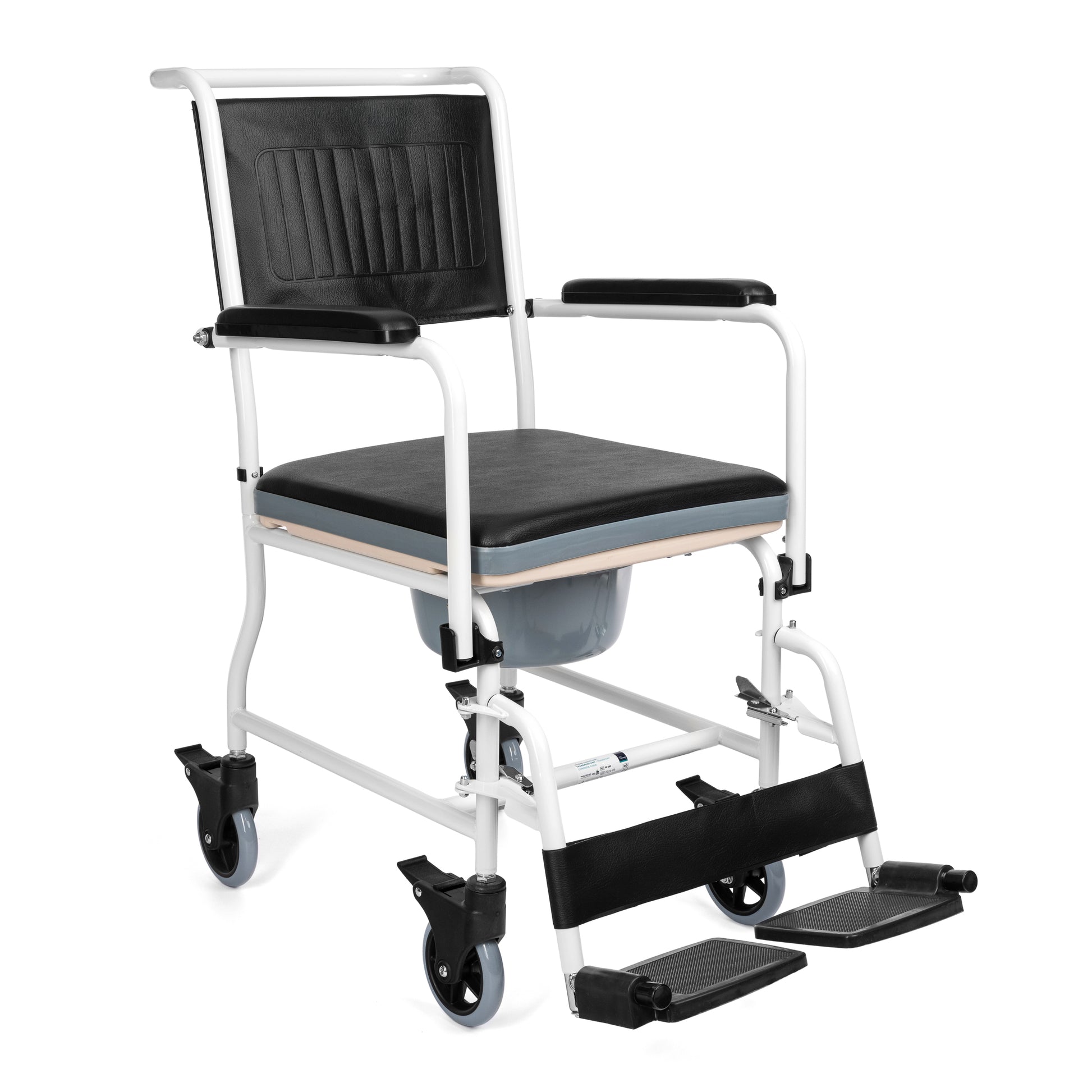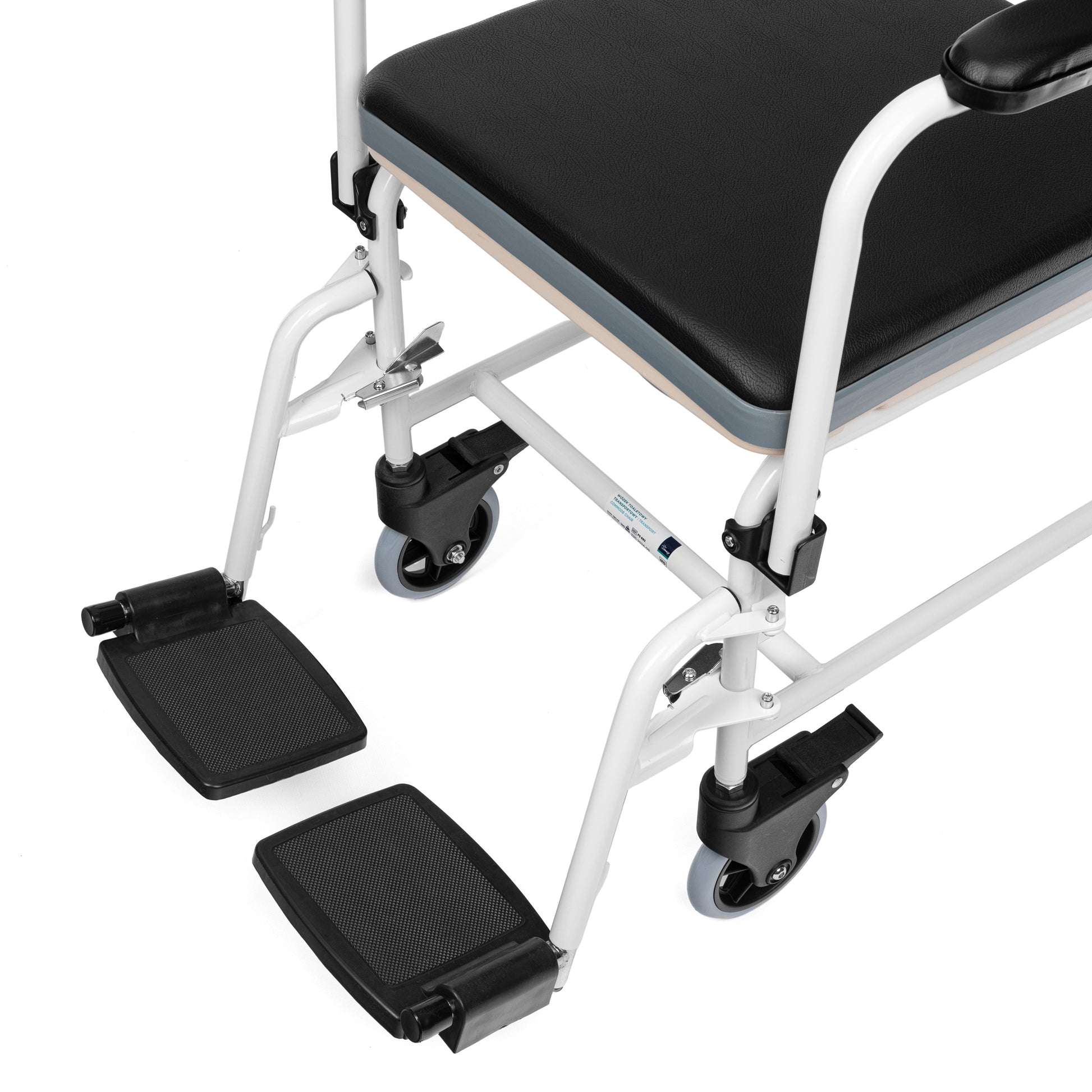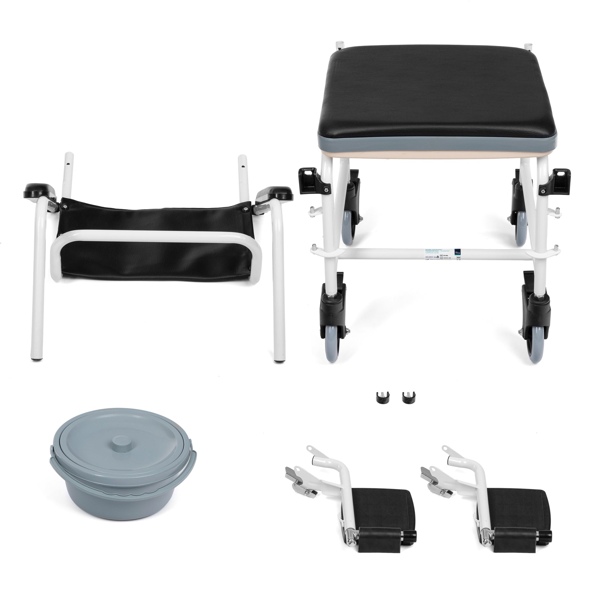 De rolstoel is voorzien van opklapbare armleuningen en opvouwbare, afneembare voetsteunen, waardoor transfers eenvoudiger en veiliger verlopen. Dankzij de ingebouwde sanitaire opvangbak hoeft de gebruiker niet overgeplaatst te worden naar een standaard toilet.