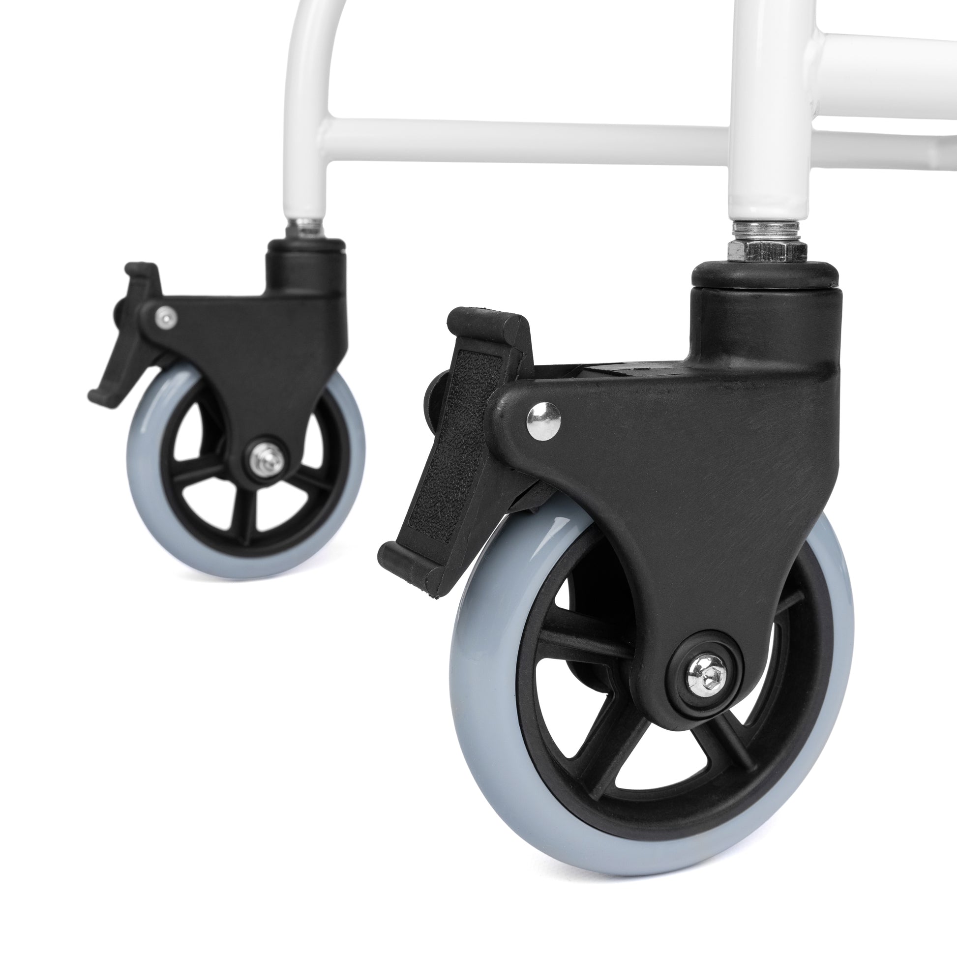 De rolstoel heeft vier zwenkwielen met remmen, waardoor hij stabiel en veilig op zijn plek blijft staan tijdens gebruik.